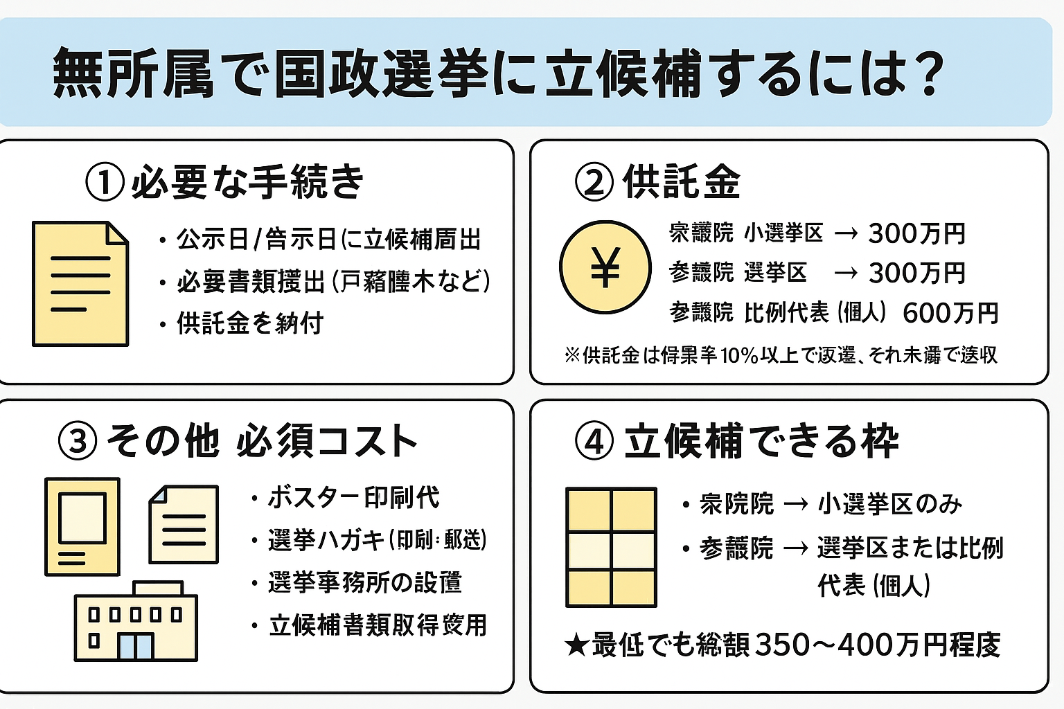 このイラストで、参議院比例代表(個人)と有りますが、様々な規定があり、比例は実質不可能だと思ってください。選挙がらみの法律は複雑怪奇ですので、必ず最後は選管や総務省などの公的機関で確認してください。AIを過信しないように。たとえば、無所属は政党に属していても、公認されていなければ無所属扱いになります。