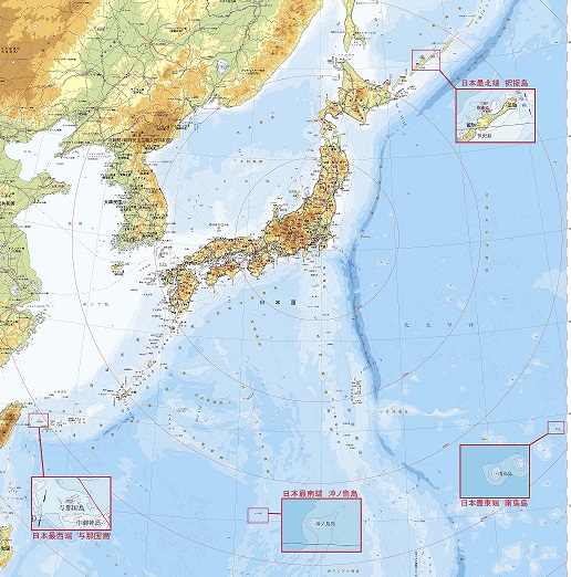 これは国土地理院が公開しているホームページからとったものである。外国に不法占拠されている島々はむろんのこと、東西南北最も遠い島もきちんと表示されている。