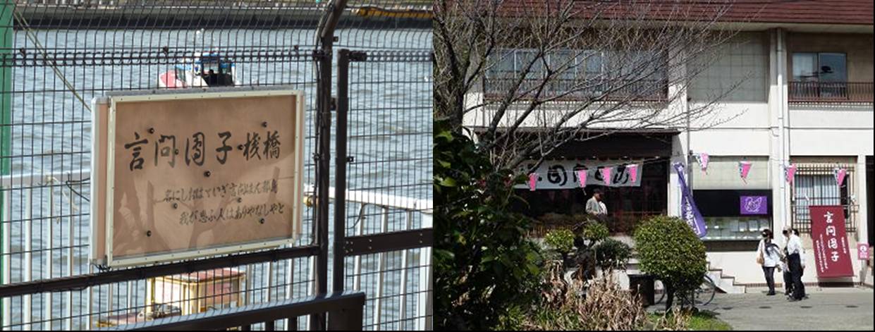 隅田川の言問橋といえば、有名なのがこの言問団子です。団子と言いながら、なぜか、串にはささっていません。 また、言問橋のあたりに店が有るのだろうと、つい思いますが、橋の周辺をいくら探しても店は見つかりません。浅草から行くと、言問橋の次の桜橋を過ぎ、さらに行ったところにようやくあります。岸辺には、言問団子桟橋なる看板が掲げてありますが、これも小さくて見過ごすかもしれません。