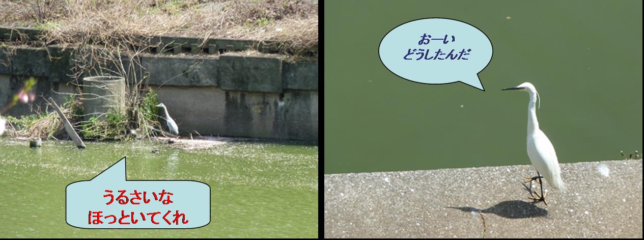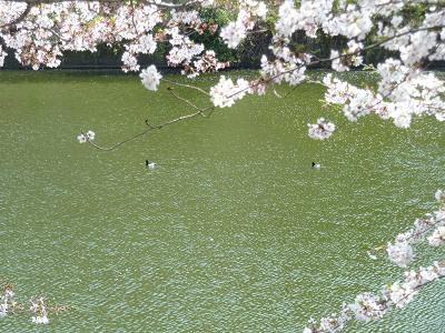 通りがかりの女性が、わざわざ声をかけてきて、「アオサギがいるわよ」と教えてくれたのは、市ヶ谷のお堀です。釣り堀のすぐわきを見たら、そこに真っ白な鳥が土手を歩いていました。「もっとむこうよ」という声に促されて少し行くと、なるほど堀の向かい側に、もう一羽いました。「はきだめに鶴」という言葉が浮かんだのですが。でも、なんで、あんなところにいるのでしょうか。夫婦喧嘩、いや仲間同士のいさかい、よくわかりませんが、動く気はなさそうでした。釣り堀のある橋を挟んだ反対側、四谷寄りにはカモが並んで泳いでいました。サギにあわなければよいのですが........。